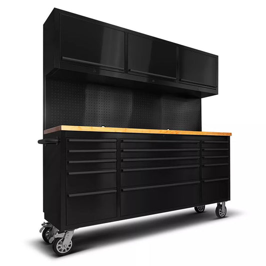 Crytec | 72" Tool Cabinet | Wooden Top | Black | Stainless Steel | 15 Drawers |